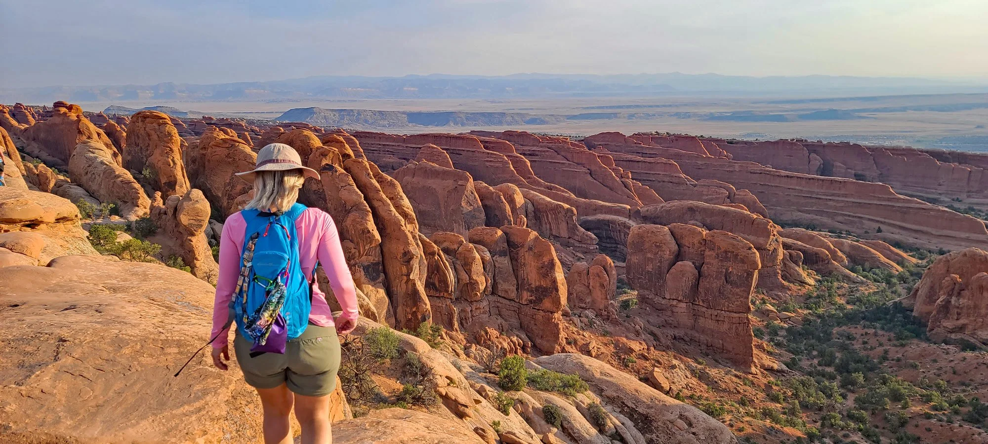 By the end of our 8.4 mile hike through the north side of Arches, we were toast. Stepping off the trail led us to a sea of parked cars and traffic being directed by park rangers. We were thrilled we’d made the wise decision of starting at the crack of dawn. Knowing we weren’t guaranteed a park elsewhere in the park, we left the window screen in place, cranked up the air, and ate a lunch in the car. Cold fried chicken and mac & cheese.